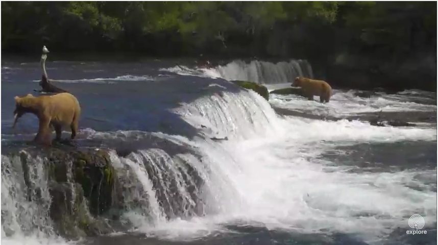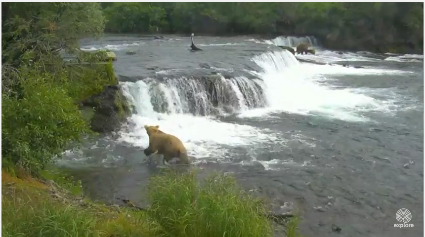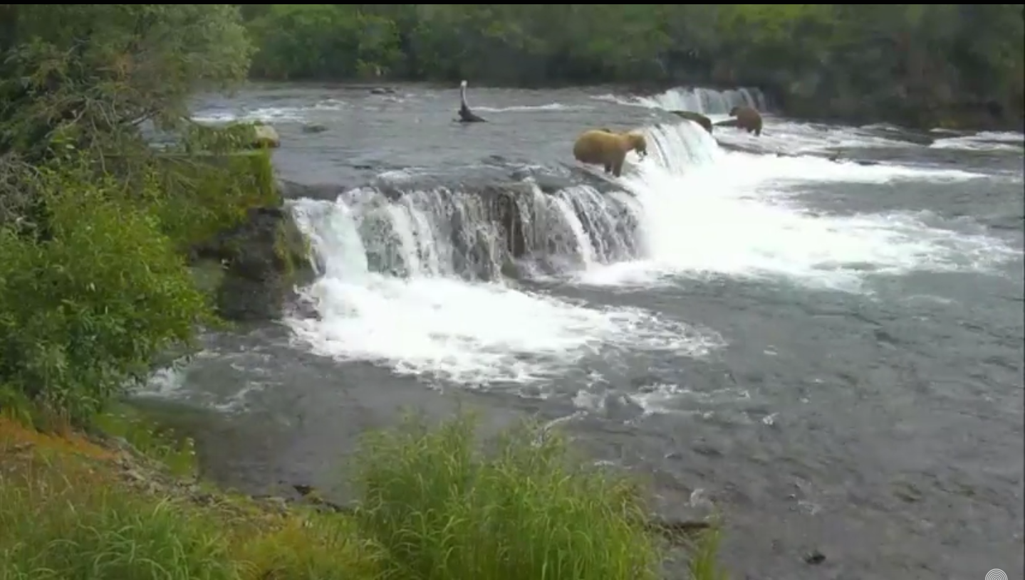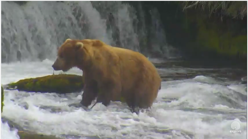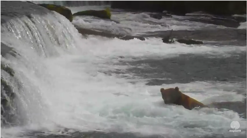 After my first attempt at field observation, I was a bit disappointed, so I hoped for a better experience today when I logged on to the Brooks Falls Live webcam to see if I was able to observe any brown bear activity. Katmai National Park is 3 hours behind my home in New Orleans (GMT -5:00), which puts it at GMT -8:00, so I planned my watching times accordingly. To my delight, I saw several different bears fishing at Brooks Falls today, observed many successful catches, and, frankly, became completely mesmerized by the bearcams. If you haven’t already checked them out, I highly recommend it. Almost any time I logged on throughout the day, I was able to see some bears. I’m going to focus my notes on three bears that I specifically saw fishing today, between approximately 10:45am and 11:35am local time at the Park. Unless (and until) I can identify their sex, I’ll refer to them as Bear C, Bear D, and Bear E.