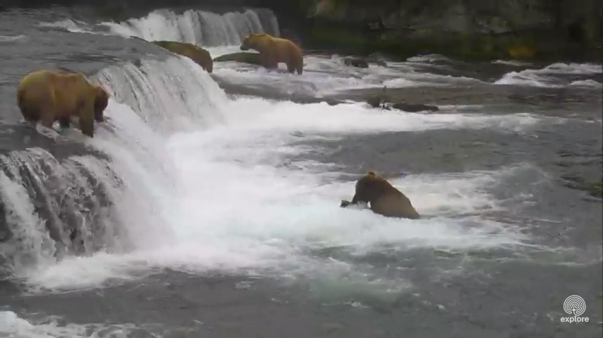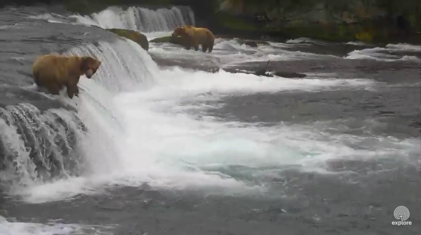 This leads me to wonder how this proximity to humans might affect the food-gathering/fishing habits of the bears here at Brooks falls. As I’ve wondered in a previous post, it’s possible that bears less comfortable with the human presence might stay in the far pool to fish, or indeed, may not come to these falls to fish at all, but might prefer other, less desirable fishing spots along the river that are less likely to be visited by humans. I’ve noticed, when the sound is working on the cameras, that the visiting humans will tend to cheer when a bear catches a fish, similar to spectators watching s sports match. This could be distracting to the bears, or intimidating to them, or affect them in some other way. Bears more comfortable with the human presence might be more likely (or more able) to fish at the spots on the falls that are closer to the visitor’s platform, namely at the lip or the jacuzzi spots. These also seem to be the spots where bears are more likely to catch fish, in my observations. I have seen more bears catch fish (or bears catch more fish) at these locations than bears at the far pool or in the space between the jacuzzi and the far pool.